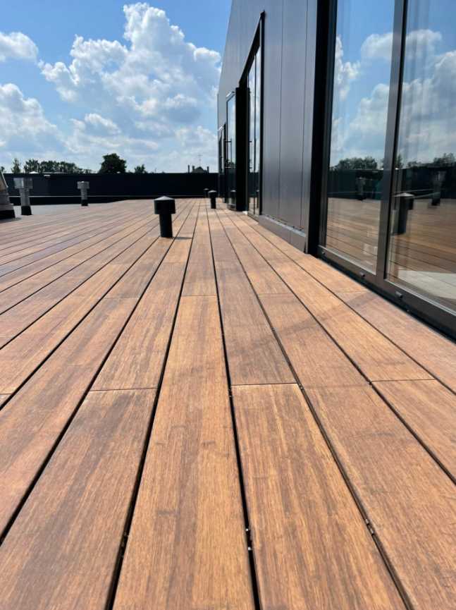 Komercinio pastato terasai (80m2) ant stogo pietinėje pusėje, užsakovas pasirinko Olandų gamintojo MOSO® bambuko X-treme® terasines lentas.